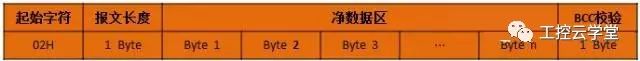 报文帧格式中起始字符固定为02H,1个字节的报文长度,之后是数据区,最后付上一个字节的BCC校验。