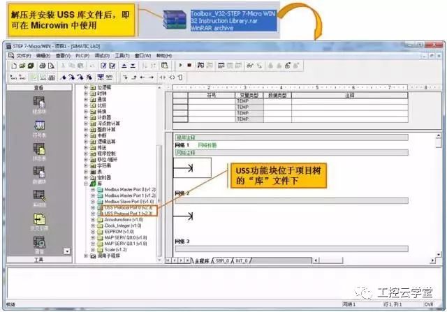 在使用USS库之前,我们首先要为Micro WIN软件安装名为Toolbox_V32-STEP 7-Micro WIN的软件包,该软件包解压并安装之后即可以在Micro WIN下看到它并使用,出现了两个文件夹,分别是USS Port0库指令和USS Port1库指令。