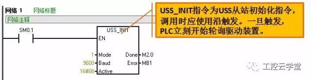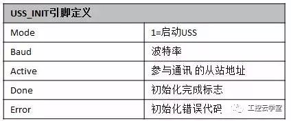 上图中的指令叫做USS_INIT,它是USS从站初始化指令,调用时应使用沿出发。一旦触发,PLC立刻开始轮询驱动装置。USS_INIT引脚定义如下图所示: