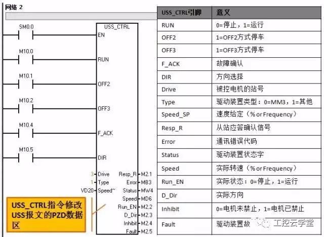 USS_CTRL这个功能块是我们真正用来控制个别从站时候所用到的指令,这个指令的引脚定义如上图右表所示,其中RUN=1的时候表示的是运行,就是让电机转起来,0的话就表示让电机停止;OFF2表示的是以OFF2的方式进行停车,OFF3表示的是以OFF3的方式停车,这是什么意思呢?通常在西门子的变频器里面停车方式有三种,分别为OFF1、OFF2和OFF3,OFF1是我们通常所讲的正常的停车,它的停车时间在变频器里面是有一个参数去设置的,OFF2叫做自由停车或者是惯性停车,它在得到OFF2的停车命令的时候,电机会以自然的、惯性的方式自由停车,OFF3我们通常称之为快速停车,它的停车时间也是可以通过改变变频器里面的参数去设置的,那么通常OFF3的停车时间要小于OFF1的停车时间,所以我们称之为快速停车,对于我们这样一个USS_CTRL功能块而言,OFF2和OFF3分别用这两个引脚来控制,而OFF1就是RUN=0的情况下就是OFF1的停车;F_ACK是故障确认;DIR是方向选择,电机正转还是反转;Drive表示的是被控电机的站号,在前面的例子当中,一个1号一个2号是我们被控的电机,那么到底是这一条USS_CTRL指令控制的是哪一台电机呢?那么通过Drive来设定;Type选择驱动器的类型,0的话是MM3系列的变频器,1是其他系列的变频器;Speed_SP是速度的设定值,可以通过百分比的形式或者是频率的0-50Hz的范围来设定,具体是以"%"为单位还是以"Hz"为单位,可以在变频器里面有参数进行选择。功能块右边的这些引脚是变频器反馈回来的一些数据,包括从站应答确认信号以及通讯错误代码、状态字等等。