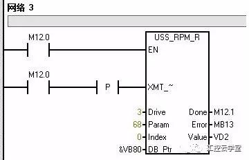 XMT_REQ是读请求,必须用沿触发;Drive表示驱动装置的站地址;Param表示要读取的参数号,我们知道变频器里的参数都有它的参数号;Index表示参数组的标识,变频器里面的参数往往是分了组的,有分成两个组也有分成四个组的,这个时候我们需要在Index里面指定我们这一次修改或者读取具体操作的是哪一组的参数;DB Ptr是读参数,读回来的数据会放在本地的哪个位置;Done、Error、Value分别是读命令完成位、错误代码和读出的数据值。