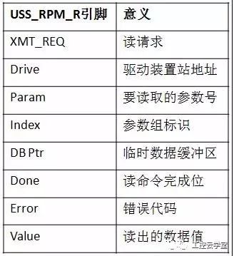 上图中的指令是USS_RPM_R指令,这是一个读实数类型参数的指令,它的引脚定义说明如下表所示: