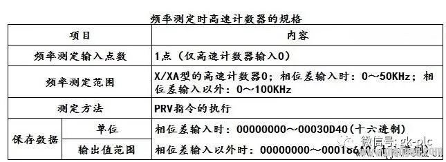 通过PRV指令,可以读取输入脉冲的频率,进行高速计数器的频率测定,将被测定频率以Hz为单位、十六进制8位输出,并且仅可在高速计数器0中使用。此外,还可在进行高速计数器0的比较动作的同时,测定频率。即使在频率测定中,也不会对高速计数器功能、脉冲输出功能等有所影响。1.高速计数器频率测定步骤(1)高速计数器的使用/不使用的设定:将plc系统设定【高速计数器O使用/不使用】设定为“使用”。(2)计数器的选择:设定PLC系统设定中的【高速计数器】/【脉冲输入方式】。(3)数值范围模式的选样:选择PLC系统设定中的【高速计数器O】/【数值范围模式】,将数值范围模式设为环形模式的情况下,选择PLC系统设定【高速计数器0】/【环形计数器最大值】。(4)高速计数器当前值的复位方式的选择:选择PLC系统设定【高速计数器0】/【复位方式】。(5)PRV指令的执行:操作数N是高速计数器的序号【高速计数器输入0:#OO1O】;操作数C是频率读取,为#0003;操作数D是频率保存通道。2.规格频率测定时的高速计数器的规格如下表所示。
