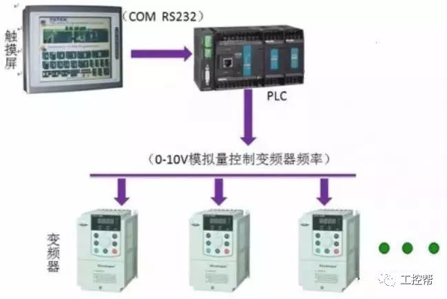 利用PLC的模拟量输出模块控制变频器。PLC的模拟量输出模块输出0~10V电压信号或4~20mA电流信号,作为变频器的模拟量输入信号,控制变频器的输出频率。