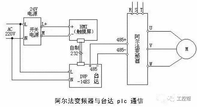 PLC与变频器通过RS-485通信接口的连接。很大一部分变频器都有一个RS-485串行接口(有的也提供RS-232C接口),采用双线连接,其设计标准适用于工业环境的应用对象。