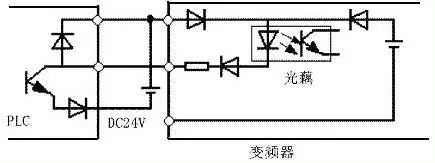 当输进开关信号进进变频器时,有时会发生外部电源和变频器控制电源(DC24V)之间的串扰。正确的连接是利用PLC电源,将外部晶体管的集电极经过二极管接到PLC。如图4所示。