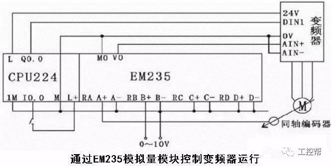 这种控制方式接线简单,但需要选择与变频器输入阻抗匹配的PLC输出模块,且PLC的模拟量输出模块价格较为昂贵,此外还需采取分压措施使变频器适应PLC的电压信号范围,在连接时注意将布线分开。
