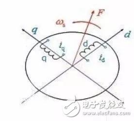 当图1和2的两个旋转磁动势大小和转速都相等时,即认为图2的两相绕组与图1的三相绕组等效。图3两个匝数相等且互相垂直的绕组d和q,其中分别通以直流电流id和iq,产生合成磁动势F,其位置相对于绕组来说是固定的。如果让包含两个绕组在内的整个铁心以同步转速旋转,则磁动势F自然也随之旋转起来,成为旋转磁动势。把这个旋转磁动势的大小和转速也控制成与图1和图2中的磁动势一样,那么这套旋转的直流绕组也就和前面两套固定的交流绕组都等效了。