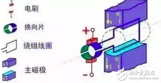 上图的直流电机的物理模型图,固定部分有磁铁,这里称作主磁极;固定部分还有电刷。转动部分有环形铁心和绕在环形铁心上的绕组。(其中2个小圆圈是为了方便表示该位置上的导体电势或电流的方向而设置的)
