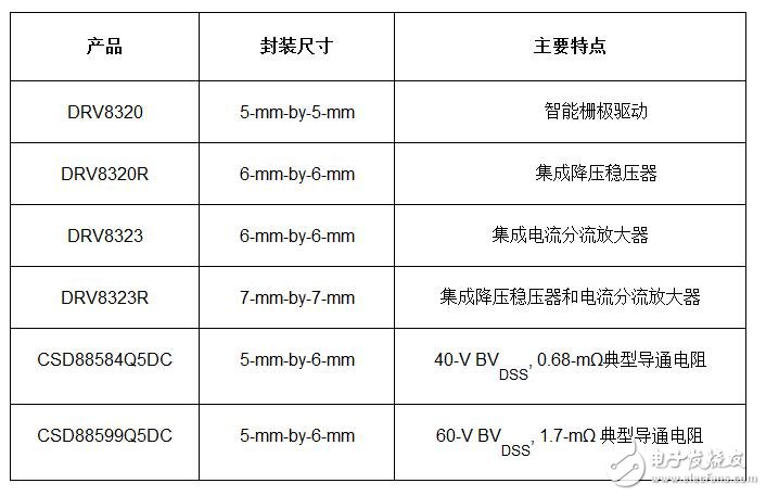 新型DRV832x BLDC智能栅极驱动器为工程师提供外围设备和接口选项,使工程师能够为其设计选择最理想的器件:带或不带一个集成降压稳压器或三个集成式电流分流放大器。每个器件选项都可以在硬件或串行接口中使用,并且采用四方扁平无引脚(QFN)封装。CSD88584/99电源模块采用DualCool小型无引脚(SON)封装,具有40或60 V击穿电压(BVDSS)选项。所有器件现已供货,封装如下表所列。