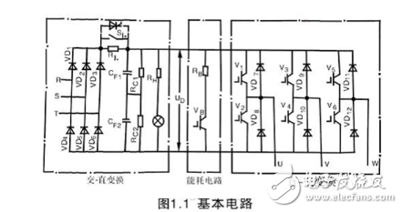 目前,通用型变频器绝大多数是交—直—交型变频器,通常尤以电压器变频器为通用,其主回路图(见图1.1),它是变频器的核心电路,由整流回路(交—直交换),直流滤波电路(能耗电路)及逆变电路(直—交变换)组成,当然还包括有限流电路、制动电路、控制电路等组成部分。