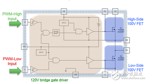 FDMF8811集成了一对100V的功率MOSFET、120 V驱动器IC和一个自举二极管到6.0 mm x 7.5 mm 的PQFN封装。