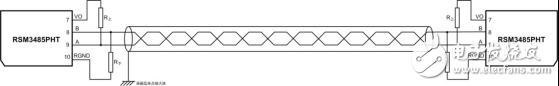 如图所示,在实际应用中,RS-485通信线可以使用屏蔽双绞线,并且屏蔽层单点接大地,可以有效抑制电快速脉冲群骚扰耦合到通信线上。