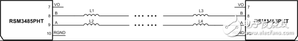 如图 4所示的电路,两个RSM3485PHT模块AB接口分别串联了磁珠,能够达到IEC 61000-4-4 ±4kV,并能够有效降低通信误码率,仅在电路中串联了磁珠,非常的便宜有效,如果要求的EFT抗扰度等级更高,那么可以适当增加磁珠的数量。