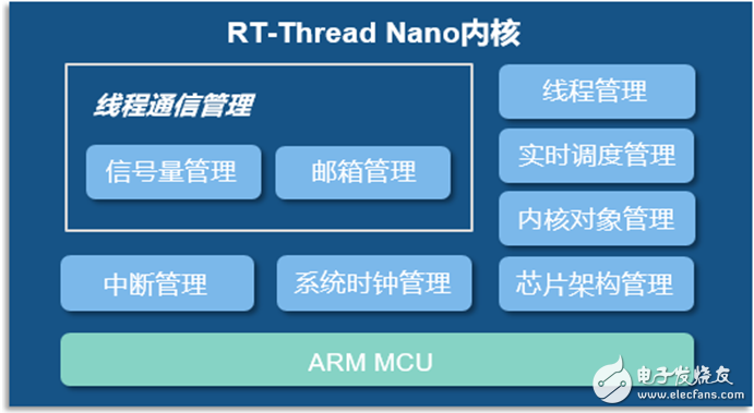 RT-Thread适时推出第一个RT-Thread Nano极简版,适用于家电、消费电子、医疗设备、工控等领域大量使用的32位ARM入门级MCU的场合,支持多任务处理、信号量和邮箱等相对完整的实时操作系统特性。占用极小的内存资源,以在Cortex-M0 MCU上运行为例,编译后,除去MCU本身需要的ROM和RAM,Nano 内核占用的ROM仅为2.5KB,RAM为1KB。