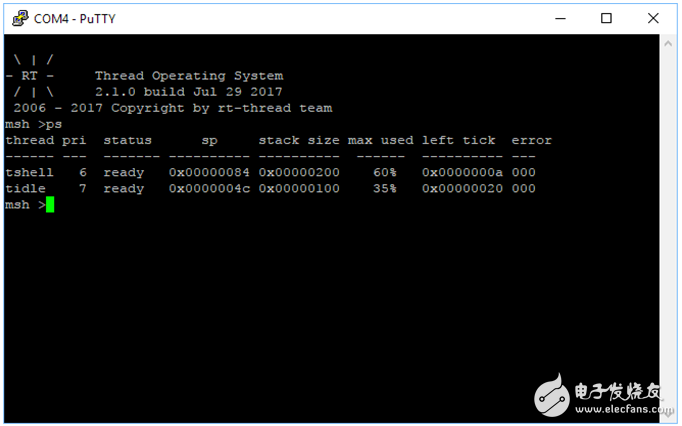 在Keil MDK工程中,也可以添加rt-thread::shell组件,这样工程还可支持命令行的特性,让硬件固件变成一个看得见摸得着的系统,产品的开发变得更加轻松、容易!