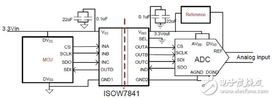图 2:用于使用ISOW7841的模数转换器感测应用的隔离电源和串行外设接口
