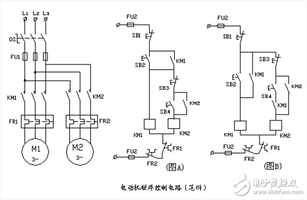 图B:控制电路由KM1线圈电路和KM2线圈电路单独构成。KM1的动合触点作为一控制条件,串接在KM2线圈电路中,只有KM1线圈得电吸合,其辅组助动合触点闭合,此时才能控制KM2线圈电路。停止按钮SB3只能控制M2电动机的停转,停止按钮SB1为全停按钮。本电路只有满足M1电动机先起动的条件,才能起动M2电动机。