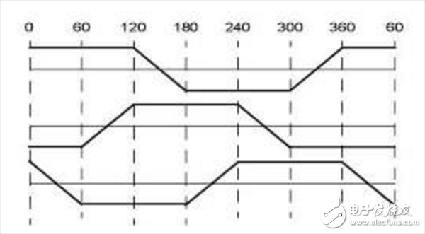 方波控制使用霍尔传感器或者无感估算算法获得电机转子的位置,然后根据转子的位置在360°的电气周期内,进行6次换向(每60°换向一次)。每个换向位置电机输出特定方向的力,因此可以说方波控制的位置精度是电气60°。由于在这种方式控制下,电机的相电流波形接近方波,所以称为方波控制。