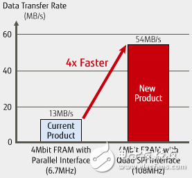 为满足市场对FRAM接口速度提升的迫切需求,富士通目前已成功开发MB85RQ4ML 4Mbit FRAM,在FRAM产品线中拥有最高数据传输速度(图一)。