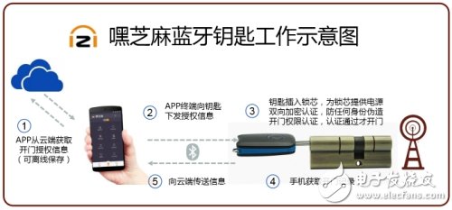 把智能钥匙插入锁芯,钥匙为锁芯提供工作电源,唤醒锁芯。授权信息经过锁芯和钥匙的双向加密认证,可以防止任何一方的身份问题(包括伪造、过期、无效等)。
