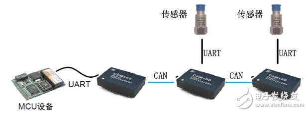 我们都知道CAN总线是一种多主总线,可以实现多节点组网通讯,自带优先级仲裁机制,可有效防止数据冲突。基于这一优点,可以利用CSM100模块为点对点通讯设备提供组网的条件。例如,某些串口接口的传感器,如果我们需要把多个传感器的数据读到MCU而MCU的串口数量不足怎么办呢?