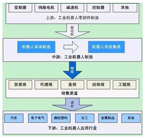 工业机器人销售多是通过直销渠道完成,而且以系统集成商居多。同时,工业机器人也可以通过经销商、代理商、贸易商、工程商等非直销当时进行销售,而且国外品牌进入中国市场一般先通过代理商形式进入。核心零部件一般是通过贸易商以及代理商等方式采购。