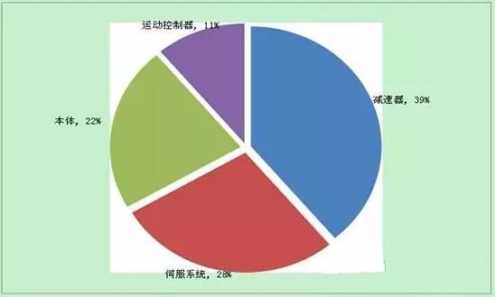 中国工业机器人上游零部件行业主要是减速机、伺服电机、变频器、控制器等,其中减速器、伺服电机及伺服系统在工业机器人成本中所占比重较大,分别为39%,28%,本体制造占比为22%。