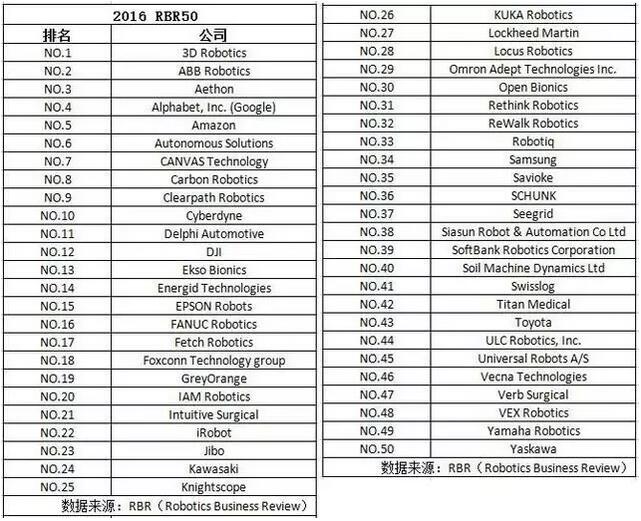 机器人行业正经历前所未有的激烈竞赛,新公司的不断涌现让人应接不暇。美国《机器人商业评论》(下称RBR)公布了第五届2016年度RBR50名单(全球最具影响力50家机器人公司),有三家中国公司跻身其中。