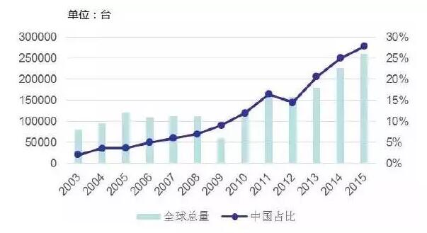 2015年中国市场销量超过75000台,同比增长36.6%,全球每售出3台机器人,就有1台卖到中国。