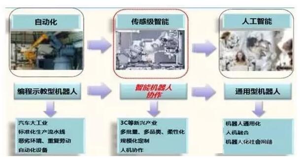 人机协作是工业机器人发展的新形态,把人的智能和机器人的高效率结合在一起,共同完成作业;简单来说就是“人”直接用“手”来操作机器人。人机协作是机器人进化的必然选择,特点是安全、易用、成本低,普通工人可以像使用电器一样操作它。