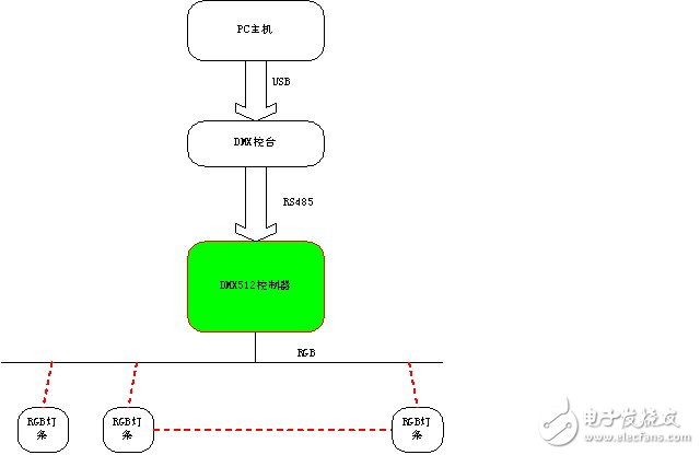 如图1为一典型的DMX灯光控制系统,PC主机通过灯光控制系统进行显示方案的设定并通过DMX控台输出给DMX控制系统。图中绿色部分为本文介绍内容,系统中的其他节点将在其他文章中进行介绍说明。