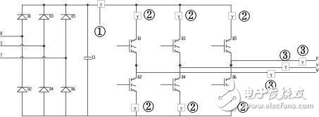 Ø 图2中②用于检测两桥臂的中的电流差,由于换相失败很容易使一相中上下两桥臂中的IBGT模块因过流而损坏,此时要求短路电流保护在短路检出后10us内切断门驱动电路,这种逆变器必须采用快速过电流保护装置,可以用霍尔电流传感器检测每个桥臂中的电流,若因换相失败造成上下桥臂同时导电,则相应的两个传感器同时检出电流信号,经与基准电压比较转换成方波后,通过门电路控制封锁所有的逆变触发脉冲,切断短路途径,保护昂贵的IBGT模块;