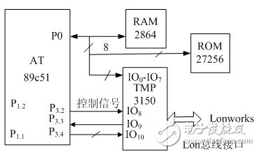 本文采用神经元芯片TMP3150与AT89c51单片机连接构成Lon总线接口电路,二者之间采用并行通讯方式。单片机AT89c51的P0口与 3150的IO0~IO7,相连作为8位的数据总线;AT89c51的P3.2与3150的IO8相连,作为单片机请求发送数据的信号线和接收3150控制命令的应答线;P3.3与IO9相连,作为神经元芯片接收数据的应答信号线;P3.4与I010。相连,用作3150发送控制命令的信号线。这样选取 P3.2和P3.3。作握手信号,保证了单片机与3150的严格同步。同时,为了避免系统受到干扰时死机,在单片机每次等待应答信号时都加入了一个延时。若延时结束还未收到应答信号,那么单片机就跳到初始状态。该Agent的电路原理如图3所示: