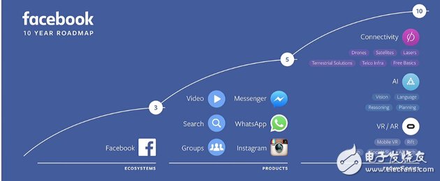 按照他的战略规划图,未来三年Facebook将主要专注于打造生态系统,未来五年的关注核心将围绕着视频、搜索、群组等诸多功能以及WhatsApp、Messenger和Instagram等应用集团,而未来十年的战略着眼点则是人工智能AI、虚拟现实VR、增强现实AR、无人机网络技术等面向未来的新技术。