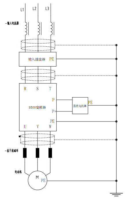 2、射频传导发射干扰:由于负载电压为脉冲状,因此变频器从电网吸取电流也是脉冲状,这种脉冲电流中包含了大量的高频成分,形成射频干扰,这种干扰的特征是会对使用同一个电网的设备形成干扰,而与设备与变频器之间的距离无关;
