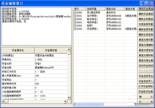 设备编辑窗口中“设备地址”=变频器通讯地址,添加要控制和监控的变量到“连接变量”;