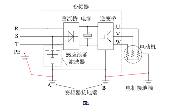 为了避免这个问题的发生,变频器硬件在设计的时候,就加入了感应电浪涌滤波器电路(其等效电路如图1所示),并将感应浪涌滤波器的接地端与变频器的外壳相 连,同时在变频器的配线说明中,要求将电机的接地端与变频器的接地端子B相连、将输入电源的地(即大地)与变频器的接地端子A相连。