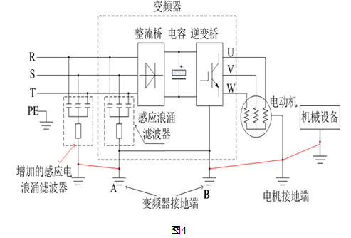 并将感应电浪涌滤波器的地与电动机的地、变频器的地接在一起(如图4中的红色线所示),让感应电浪涌滤波器再一次对电机的感应电进行吸收和泄放,进一步减 小感应电压,达到防止漏电电人的目前的。增加的感应电浪涌滤波器的电路原理与变频器内部的浪涌滤波电路是一样的,是由于体积太大,没法设计安装在变频器内 部电路里面,因此做成外接方式。