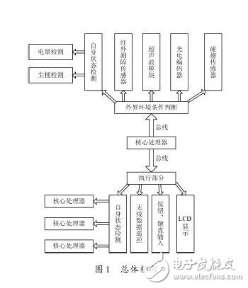 主要包括3部分:用于测量和感知障碍物的超声模块、红外和碰撞传感器,用于状态检测的传感器(检测电池电量、尘桶、电机堵转悬空)。传感器模块使机器人对周围环境做出正确判断,为顺利完成任务提供智能决策。