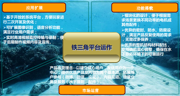 在产品运营方面,吉影团队以“一个中心,两个基本点”为指导原则,以建立核心用户,发烧用户为一个中心,提供优质产品及内容为两个基本点。拓展用户参与(微博、微信、论坛)、内容互动、增值业务及服务(水下摄影,配件)。