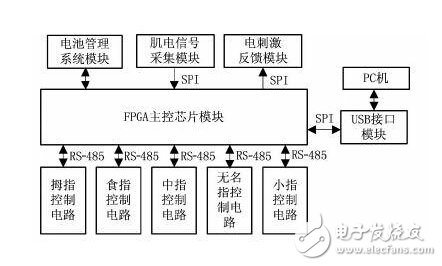 仿人假手电气控制系统用于实现假手各手指的驱动控制、多种传感器信息的采集以及与上位机( PC或PCI控制卡)之间的通信。该控制系统由10个模块组成,分别为:由FPGA组成的主控芯片模块、USB接口模块、拇指控制电路模块、食指控制电路模块、中指控制电路模块、无名指控制电路模块、小指控制电路模块、肌电信号采集模块、电池管理系统模块、电刺激反馈模块。模块化设计方法增加了控制系统的灵活性与独立性,便于对模块单独进行调试与修改。电气系统总体功能框图如图1.
