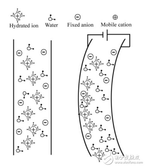 一般是对IPMC厚度方向施加电压时,IPMC会向阳极弯曲,原理见下图。那人们自然可以利用这个特点:通电——形变——驱动,把他用在机器人身上,让它产生相应的运动。而且这种材料体积小,质量轻,能够产生大运动,并且不需要轴承和滑动部件,驱动电压低。这些特点看起来,当然要好过电机那个大个头,可以减少占地空间。