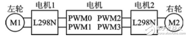 具体驱动过程为:通过编程由控制芯片经PWM发出驱动信号,PWM输出作为L298N的输入,经L298N转换输出控制信号使电机转动,从而实现电动机的驱动。
