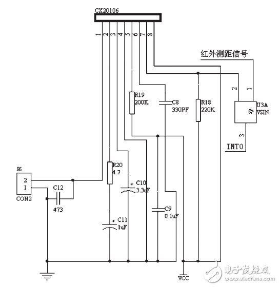 如图5所示, 超声波接收处理电路采用集成电路CX20106. CX20106接收到与其中心频率相符的信号时, 7脚就输出低电平。 7脚输出的脉冲下降沿和红外传感器测距信号相与后接单片机中断口。