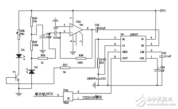 红外测距电路如图6所示, LM567可以构成低频振荡器作为红外传感系统的编码电路, 即利用其内部的压控振荡器来产生低频信号, 由于R25=10.9kΩ, C25=2200pF, 根据公式f0 =1/1.1RC,5脚输出频率38.91kHz的脉冲信号。 此脉冲信号使三极管T1(8050)工作于开关状态, 驱动红外发光二极管发出的红外脉冲。 采用这种方法省去了信号发生电路, 简化了线路和调试工作, 又防止了周围环境变化和元件参数变化对收发频率造成的差异, 实现了红外线发射与接收工作频率的同步自动跟踪, 使电路的稳定性和抗干扰能力大大加强。