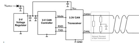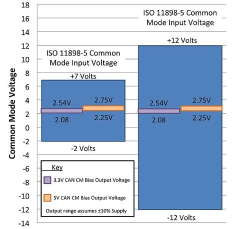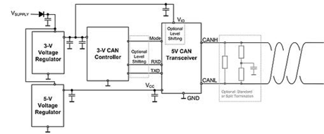 一个常有的顾虑就是针对5V和3.3V CAN收发器的共模偏置电压的不同,以及这可能导致的通信问题。幸运的是,这个问题已经由ISO18898-2标准所解决,这个标准需要CAN兼容收发器的接收器部分能够处理-2V至+7V的共模范围。这一要求在ISO11898-5标准发布版本中被进一步扩展至±12V范围。