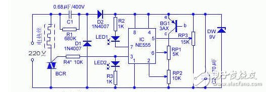 工作原理:电路如下图所示。图中IC为NE555时基电路;RP3为温度调节电位器,其滑动臂电位决定IC的触发电位V2和阈电位Vf,且V5=Vf=2Vz。220V交流电压经C1、R1限流降压,D1、D2整流,C2滤波,DW稳压后,获得9V左右的电压供IC用。室温下接通电源,因已调V2