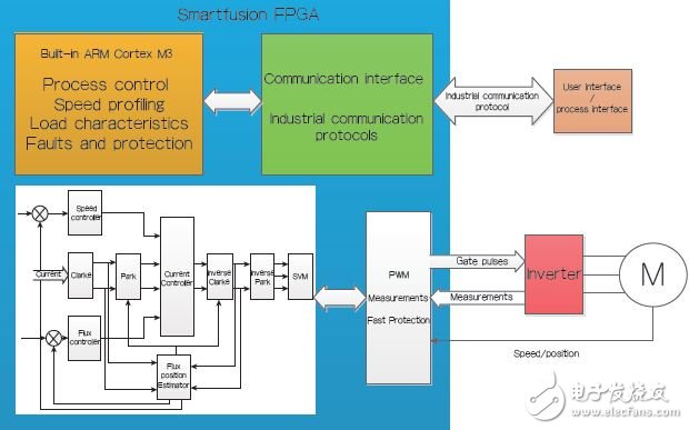 控制方面可以分为两个部分。一个部分用于运行磁场定向控制(FOC)算法、速度控制、电流控制、速度估计、位置估计和PWM生成;另一个部分则包括速度曲线、负载特性、过程控制和保护(故障和报警)。执行FOC算法属于时间关键型,需要在极高的采样速率下进行(在微秒范围),特别是针对具有低定子电感的高速电机。这使得在FPGA中实现FOC算法变得更优越。过程控制、速度曲线和其他保护无需快速更新,因而能够以较低的采样速率执行(在毫秒范围),并且能够在内置Cortex-M3子系统中进行编程。