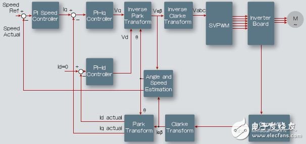 (1)电机控制IP模块。图3为无传感器磁场定向控制算法,这一部分将会讨论这些模块,它们作为IP核提供。